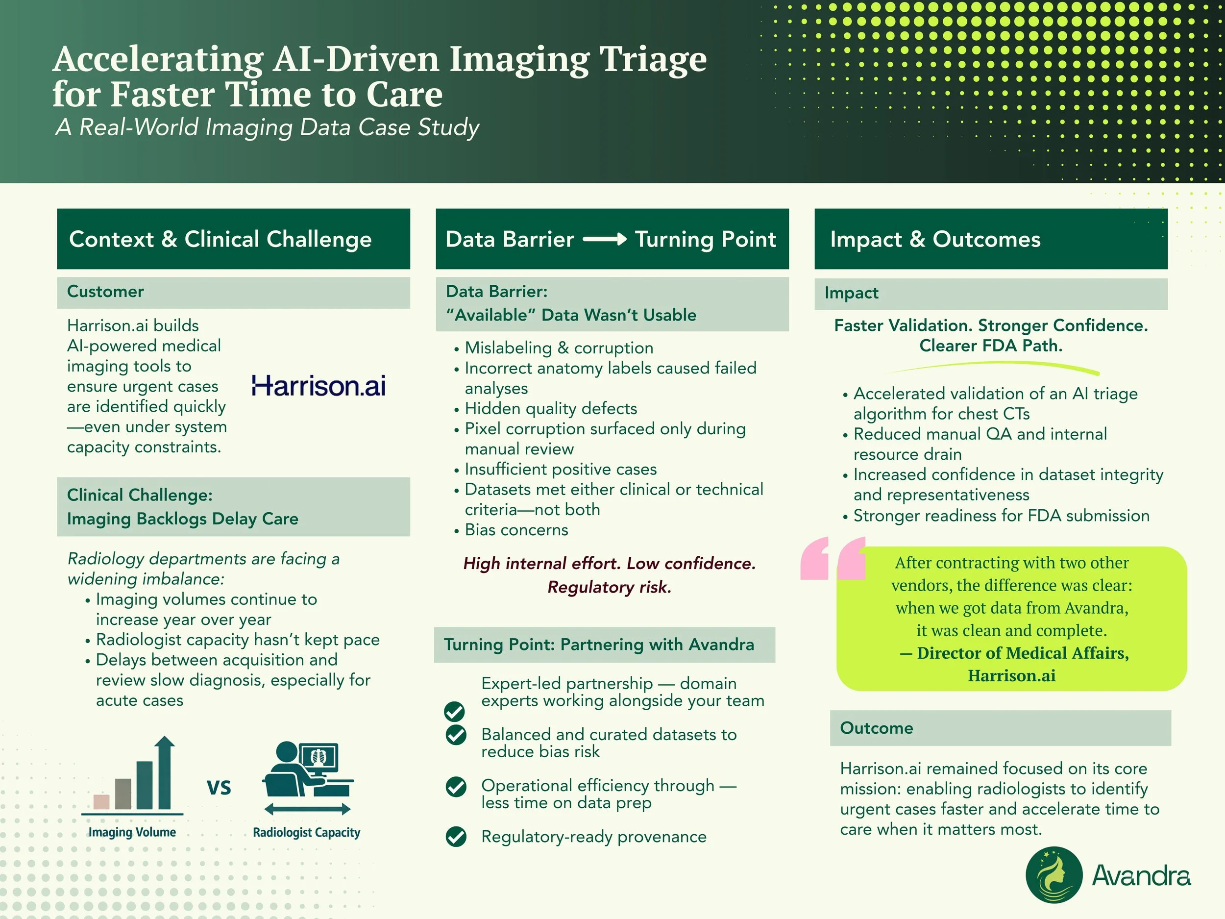 When the team partnered with Avandra, they were able to access curated, clinically-consistent imaging data sourced directly from trusted health system partners, allowing them to accelerate validation of their triage algorithm while preparing for FDA submission.